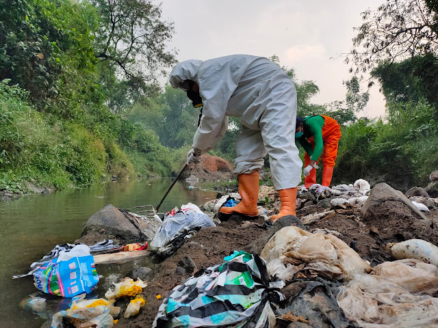 | Anggota Brigade Evakuasi Popok mengangkat sampah popok di Jembatan Dinoyo kabupaten Mojokerto |